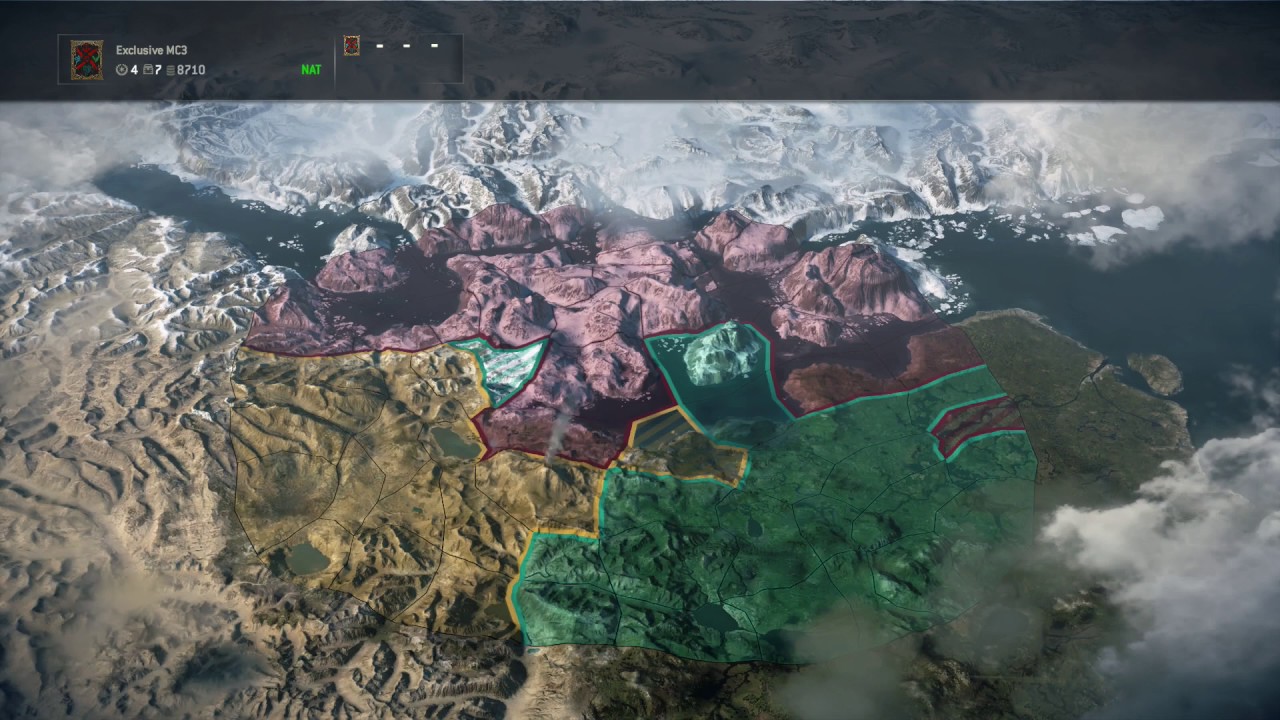 Each online multiplayer match awards War Assets based on the outcome and the player’s performance. These War Assets are then deployed in the Faction War – which stretches across all platforms – where they are used either to defend an allied territory or conquer a neighboring one occupied by an enemy faction, with the most war assets deployed in a given territory determining the victor. Territories controlled are updated every six hours, while rounds last for two weeks and seasons last for ten weeks (five rounds). As the war progresses and territories change, the changing front will determine which maps that are played and their appearance (each map has variants depending on whether it is under Samurai, Knight or Viking control.) Players who have distinguished themselves and helped their faction gain and defend ground earn higher quality equipment as spoils of war after each round and each season. After a season ends, the map is reset and a new season begins after an offseason period, but the outcome of the previous season impacts the story background of the new season.